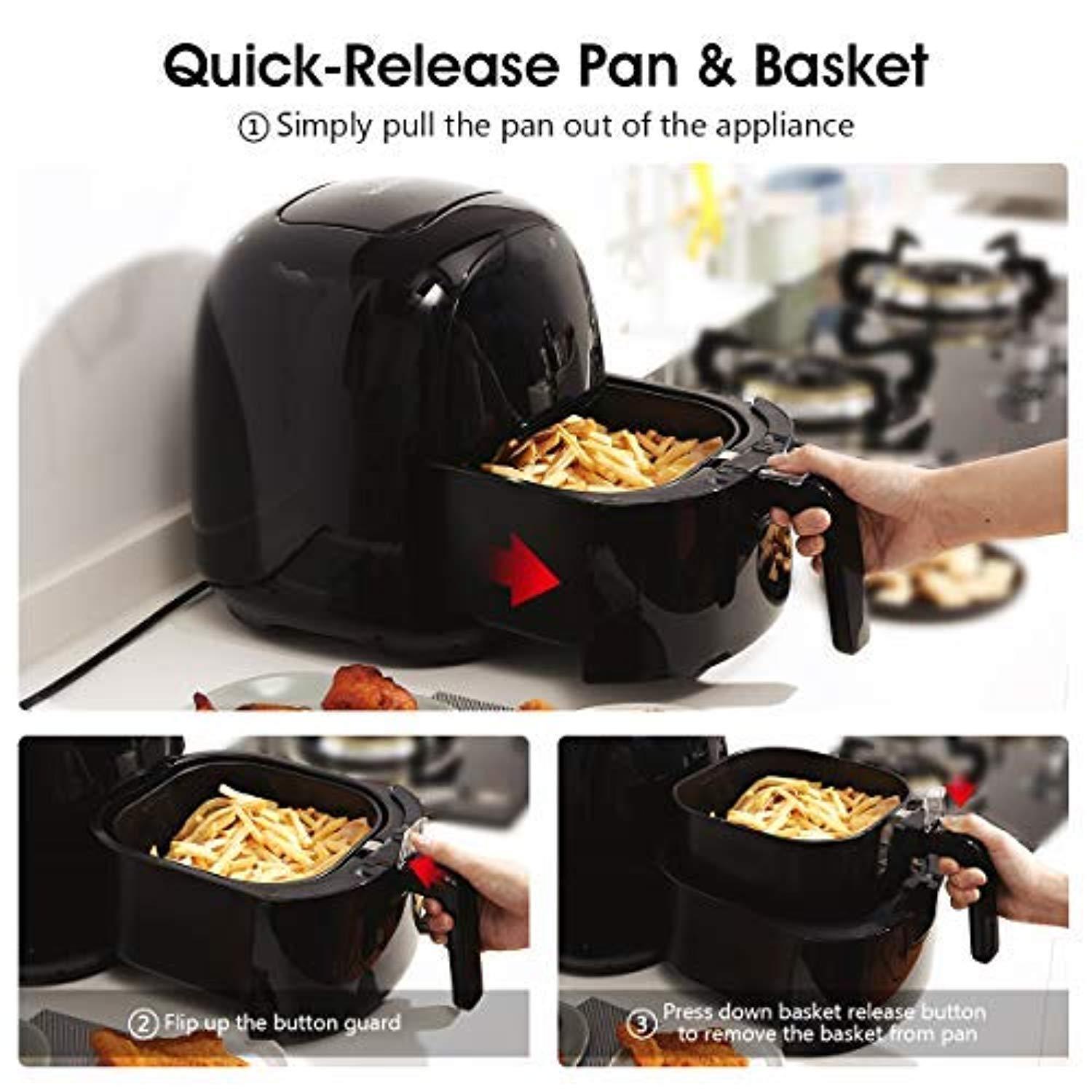 • ★【SAFETY & PROTECTION】 The electric air fryer comes with auto-off and overheat protection function. Airfryer will automatically shut down when the basket is removed or the temperature is too high in operation. And cooking will continue with same setting beforehand when the fry pot returns. Our product fills cooking with safety protection.
