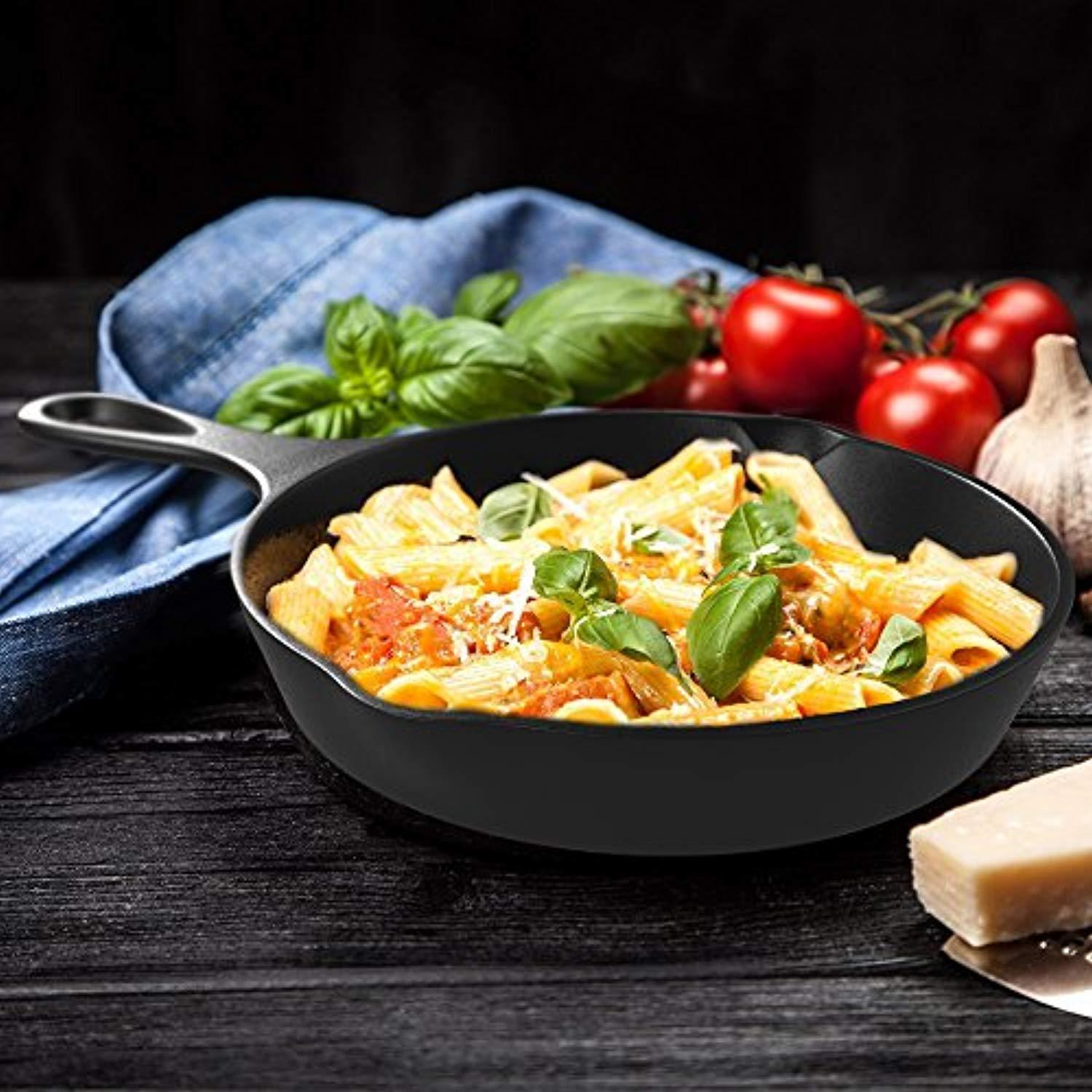 • PRE-SEASONED – Pre-seasoned with soy-based oil to make it ready to be used straight out of the box, which is much more effective than at home pre-seasoning. Factory pre-seasoning makes our cast iron skillets virtually non-stick, easy to clean, protected against scratches, and will also make your food rich in flavor!(but re-seasoning is recommended to avoid sticking issues for a smoother and non-stick surface).