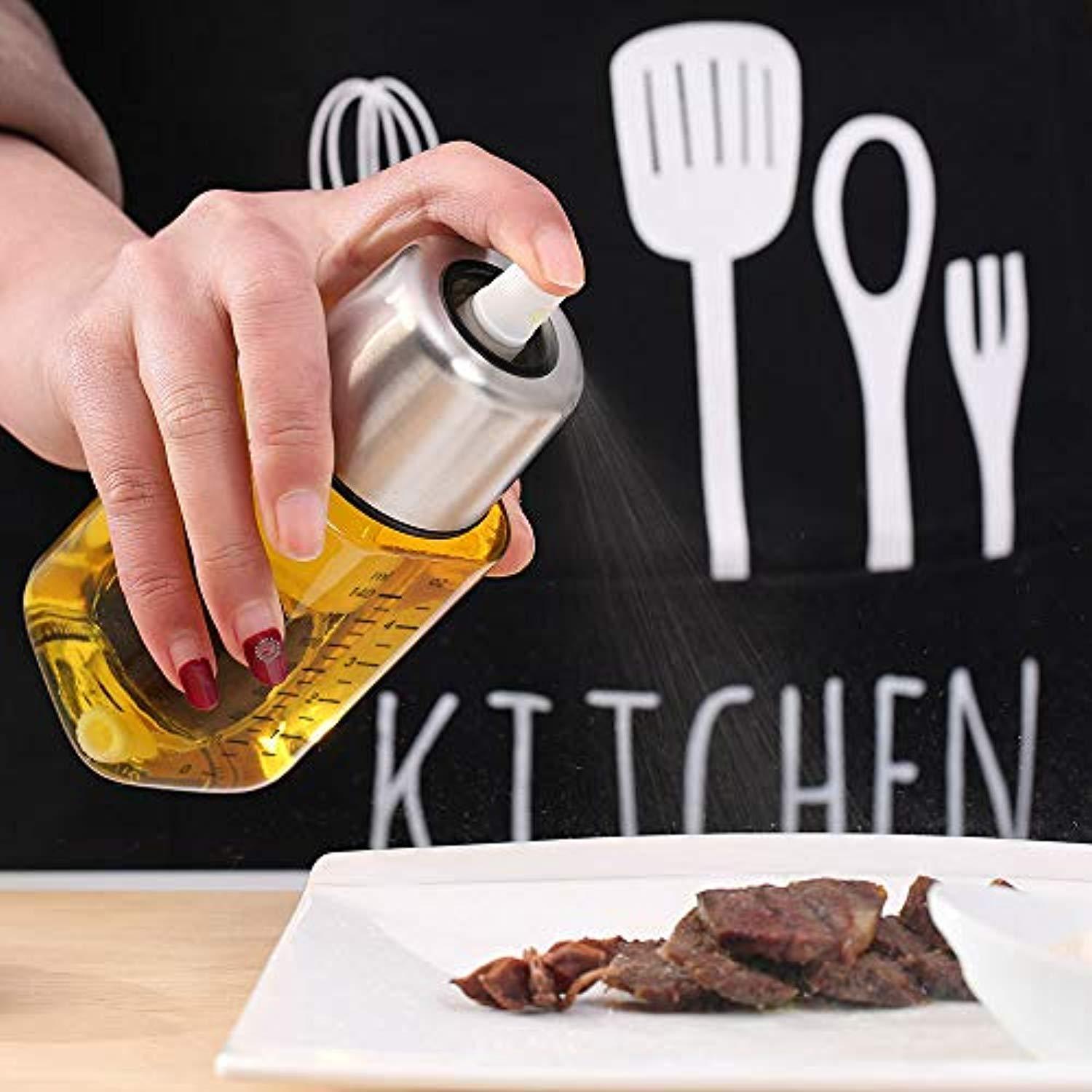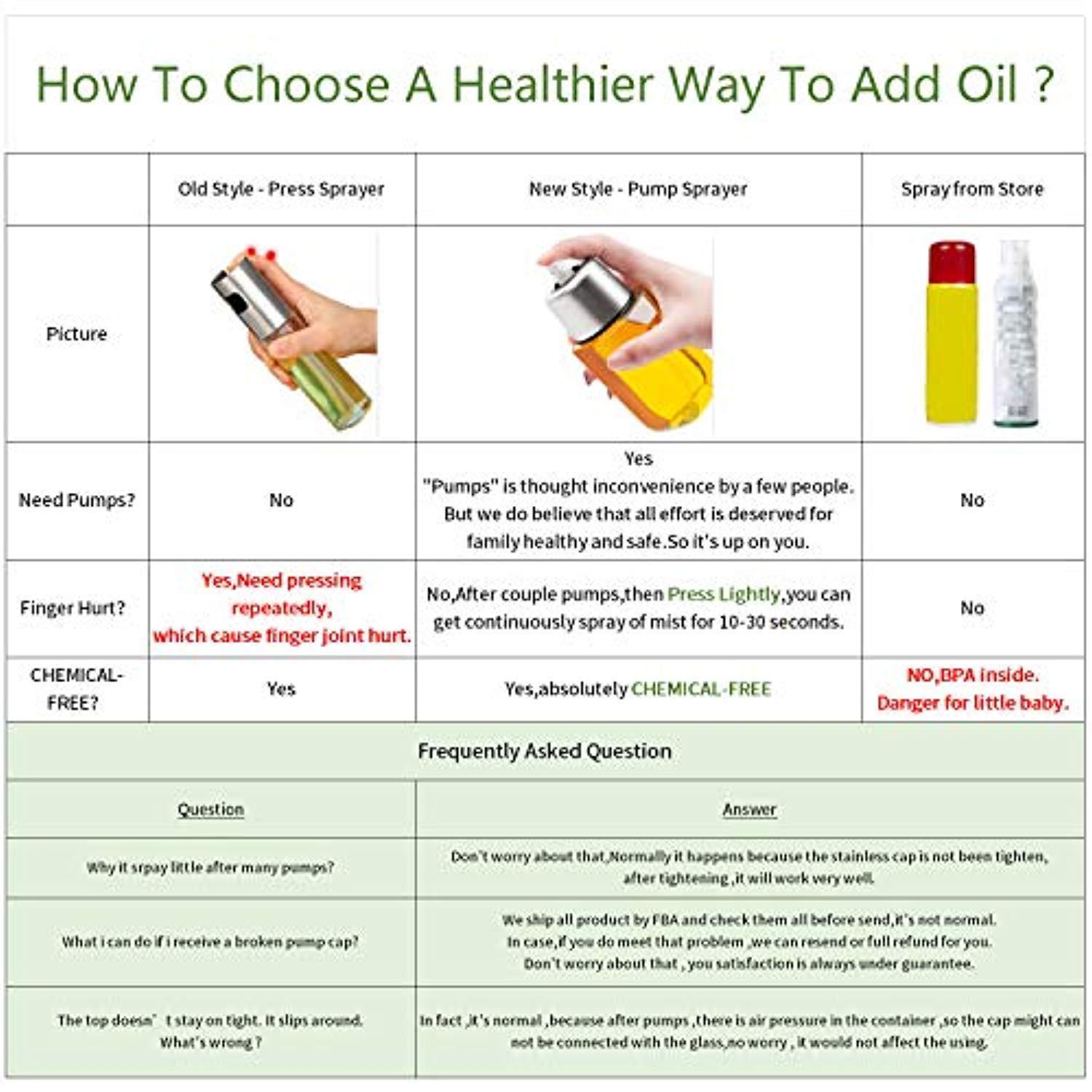 • ❤ HEALTHY & CHEMICAL-FREE -- Do you really know what cooking spray from store contain inside?If you know what i mean,It’s time to take the action to change the way to spray oil.When it come to the pump oil sprayer,approved by FDA,with No any BPA and CHEMICAL-FREE,though the transparent glass,you can see everything inside.Just need couple pumps,healthy and safety come back and be on your control again.Spray instead of pouring to control the amount of oil,then to keep fitness,It’s that simple!