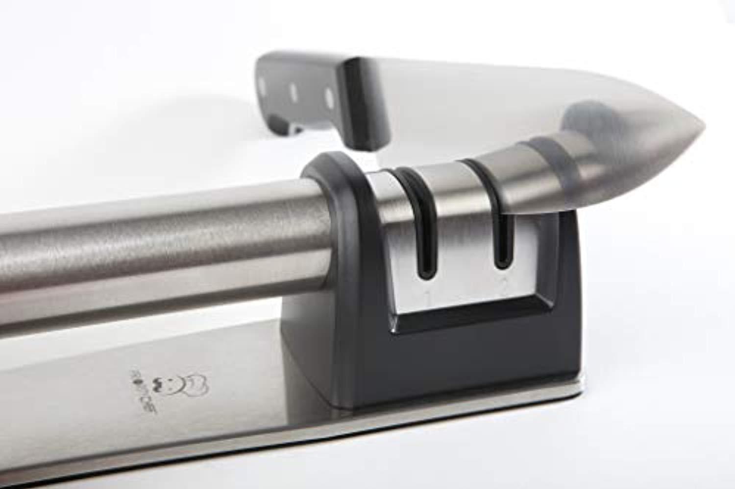 • STYLISH, ERGONOMIC DESIGN AND DURABLE CONSTRUCTION. With its 2-stage sharpening system, you can polish your blades to razor-sharpness. This product is also designed for comfort. The non-slip cushion at its bottom offers a more vibrator base while its ergonomic handle provides a comfortable, easy grip. It’s the perfect complement in most kitchens!