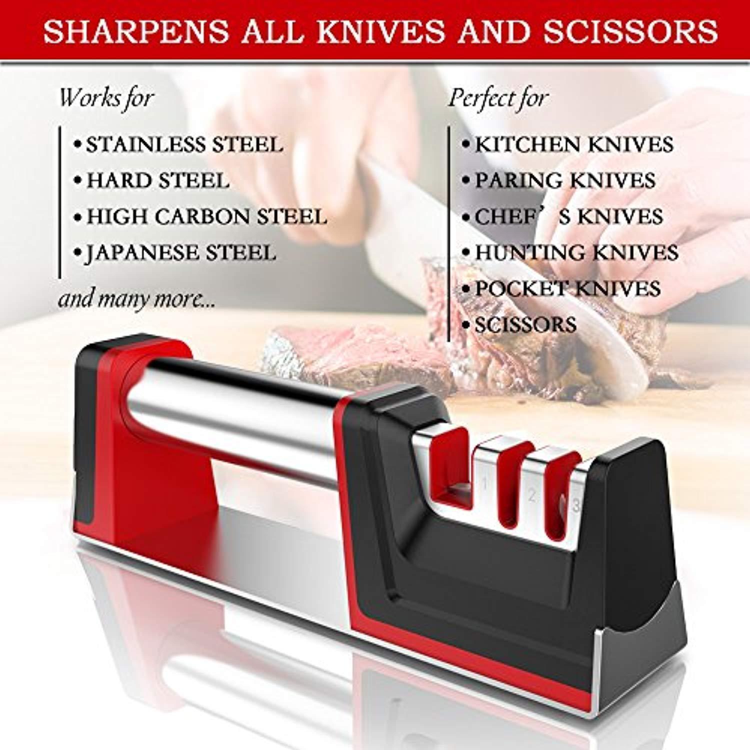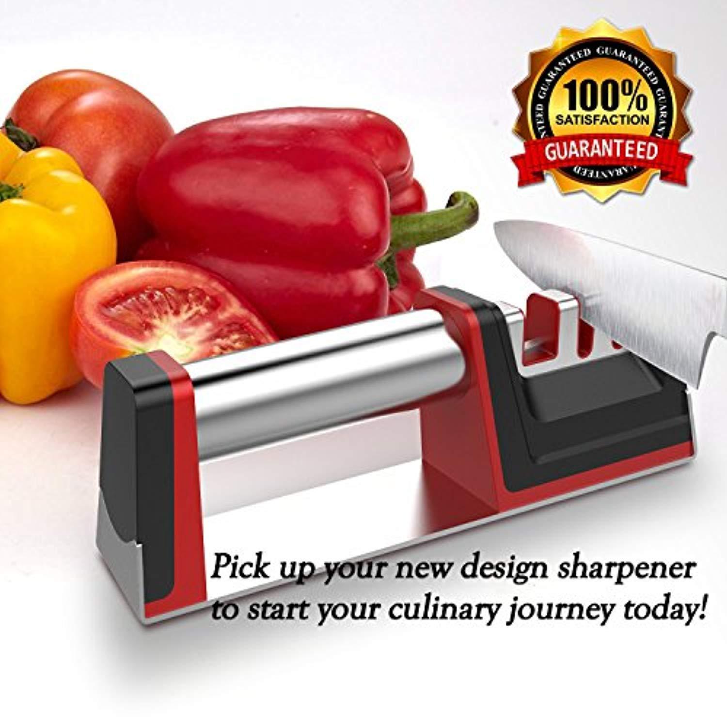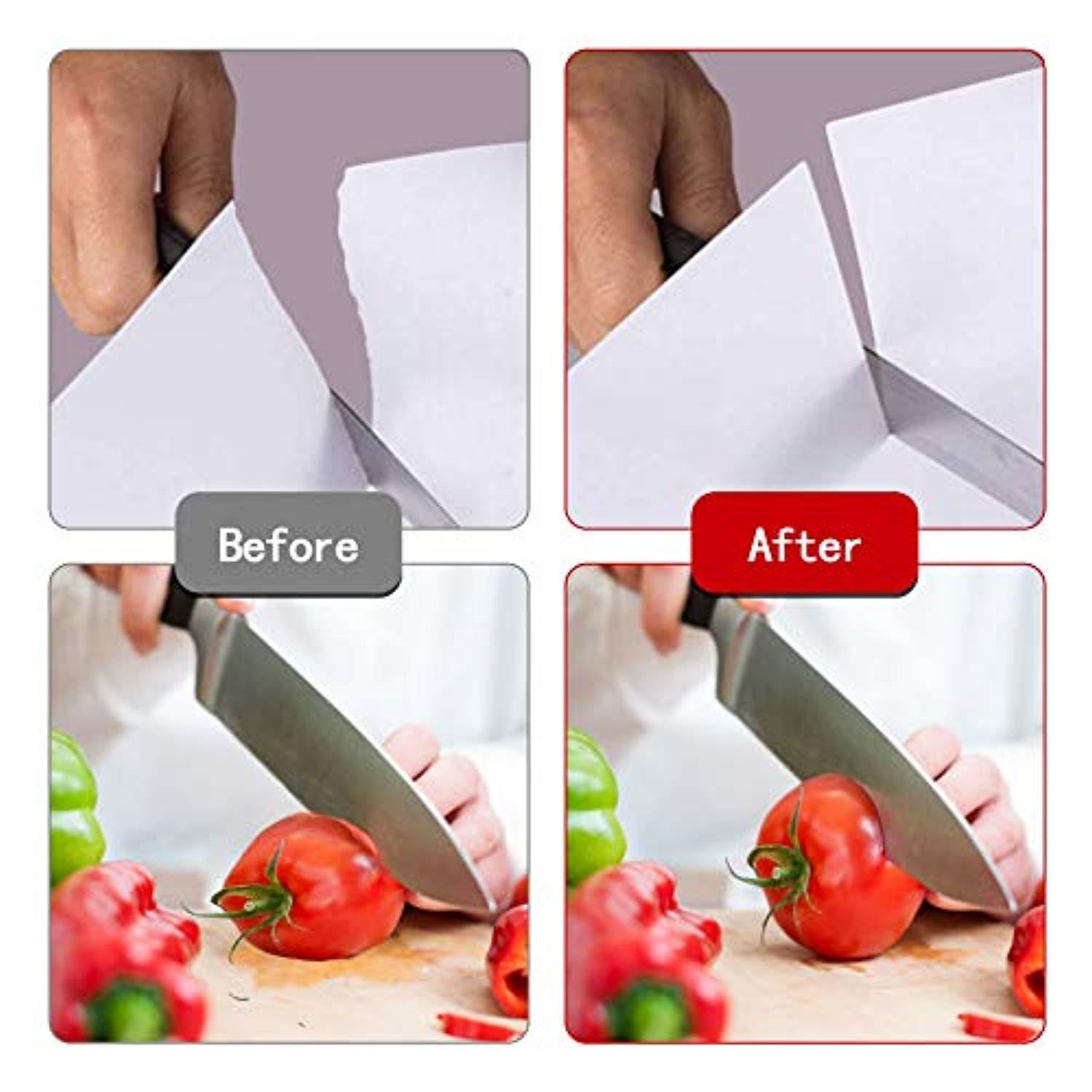 • SAVE MONEY - Our sharpener helps you rejuvenate your old set of knives and tells you that you don't have to spend a lot of money to buy a new set of knives. Simply position the dull blade on the sharpening slot and enjoy razor-sharpness in just seconds. Don't take our word for it, buy this sharpener and if it does Not sharpen your knife, we will refund you in full no questions asked.