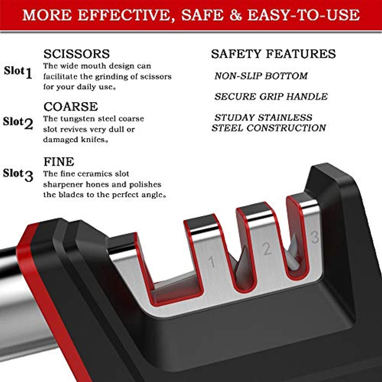 • MORE EFFECTIVE, SAFE & EASY-TO-USE - The coarse slot revives very dull or damaged knives. The fine ceramic knife sharpener hones and polishes the blade to the perfect angle. The wide mouth design by carbide can facilitate the grinding of scissors for your daily use. Our non-slip grip bottom keeps the pocket knife sharpener steady and easy to hold. Sharpening has never been easier.
