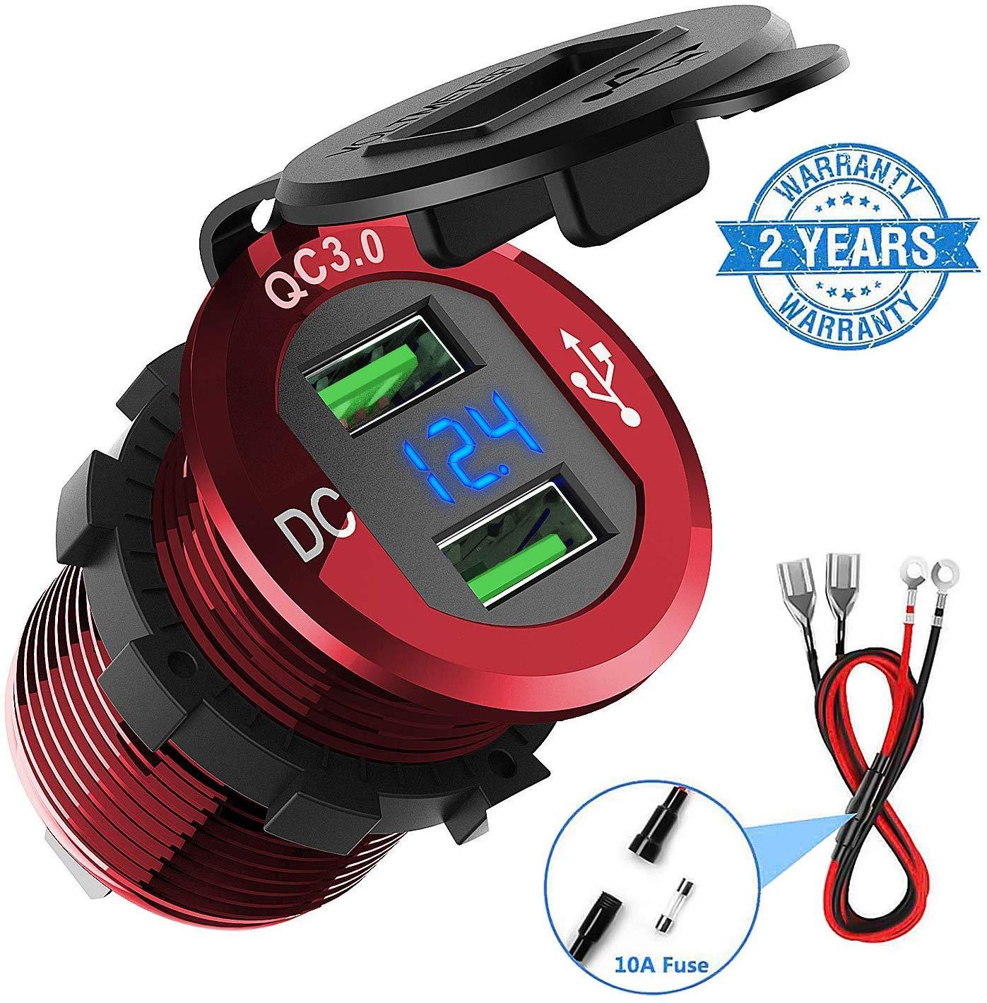 Quick Charge 3.0 Car Charger, CHGeek 12V/24V 36W Aluminum Waterproof Dual QC3.0 USB Fast Charger Socket Power Outlet with LED Digital Voltmeter for Marine, Boat, Motorcycle, Truck, Golf Cart and More
