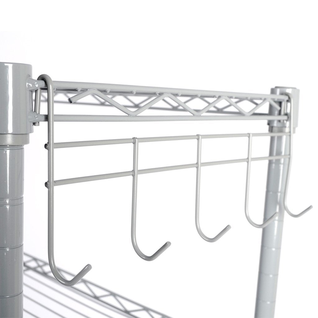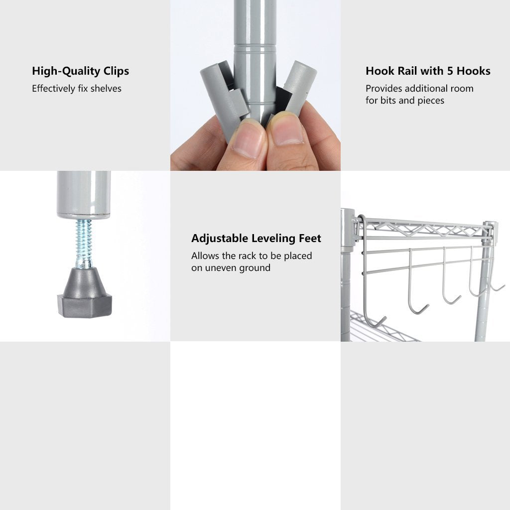 • SMART STORAGE: The side hook-rail with 5 hooks and the shelves themselves give plenty of storage options, feature a sleek and strong wire mesh, being able to store and hold whatever you put on it.