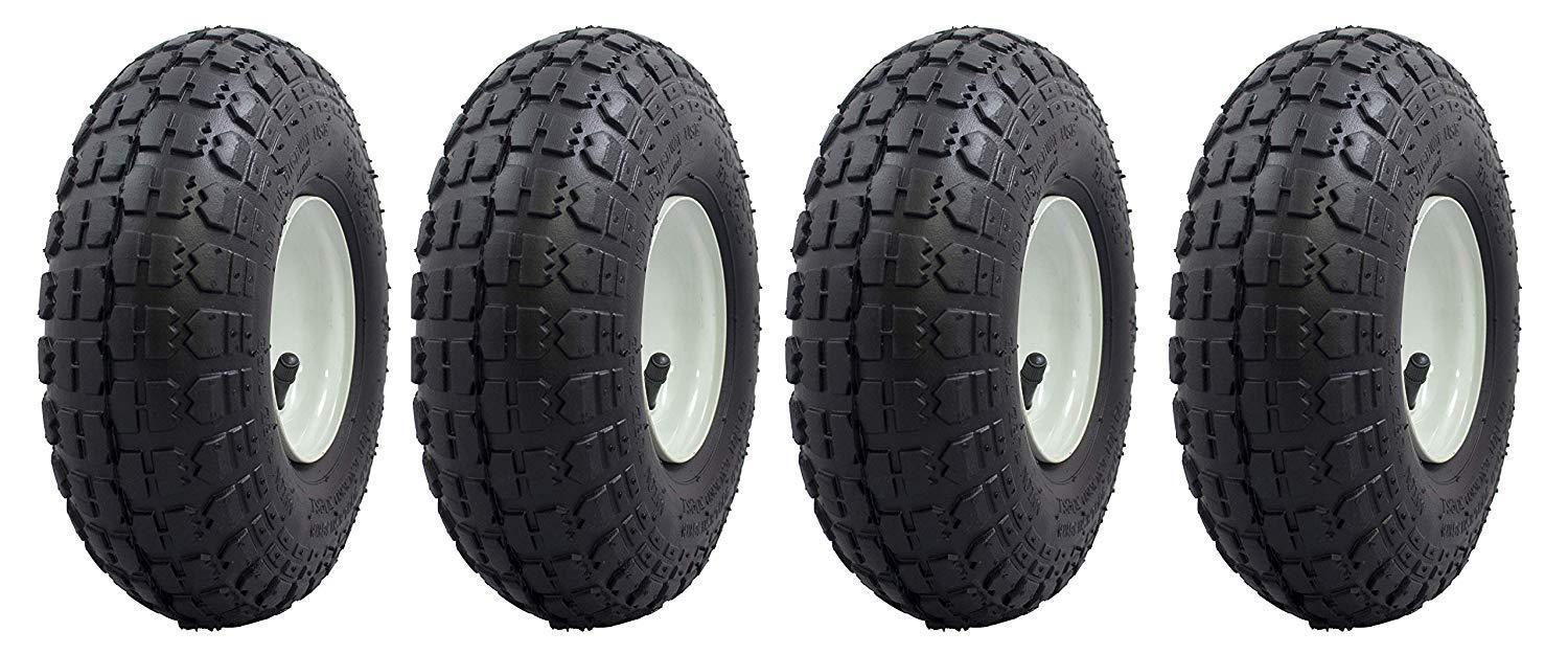 Pack of 4 – 10” 2 ply air-filled/pneumatic tube-type tires on Solid Steel wheels Easy replacement for...