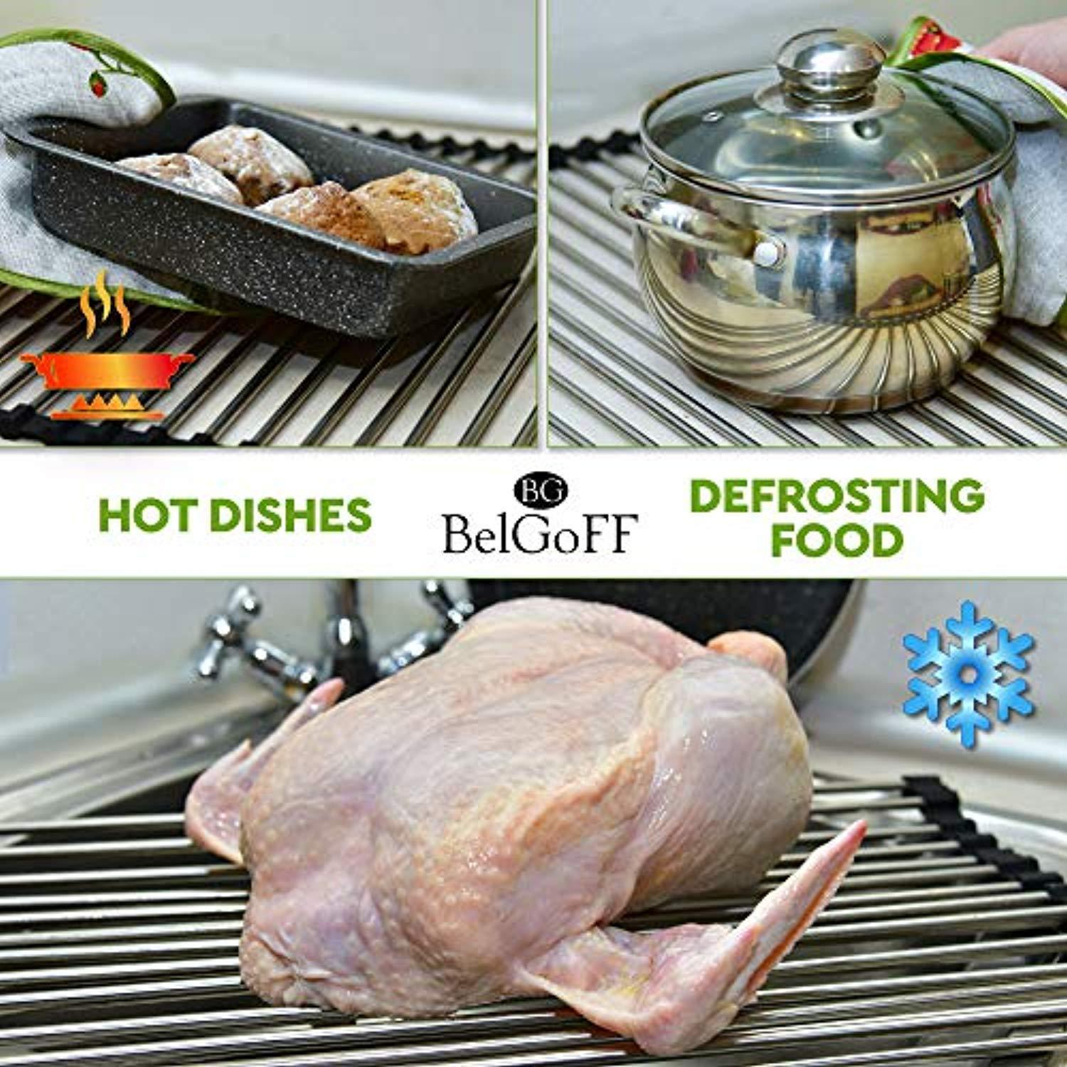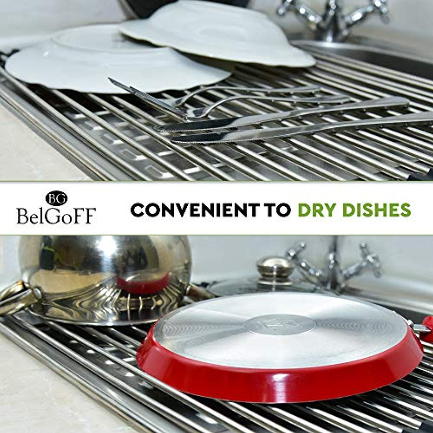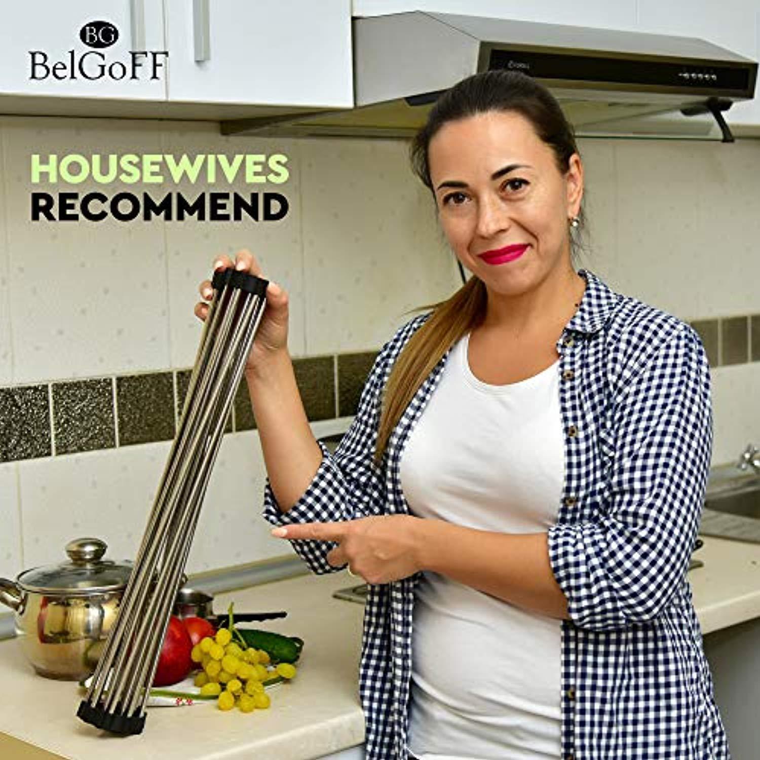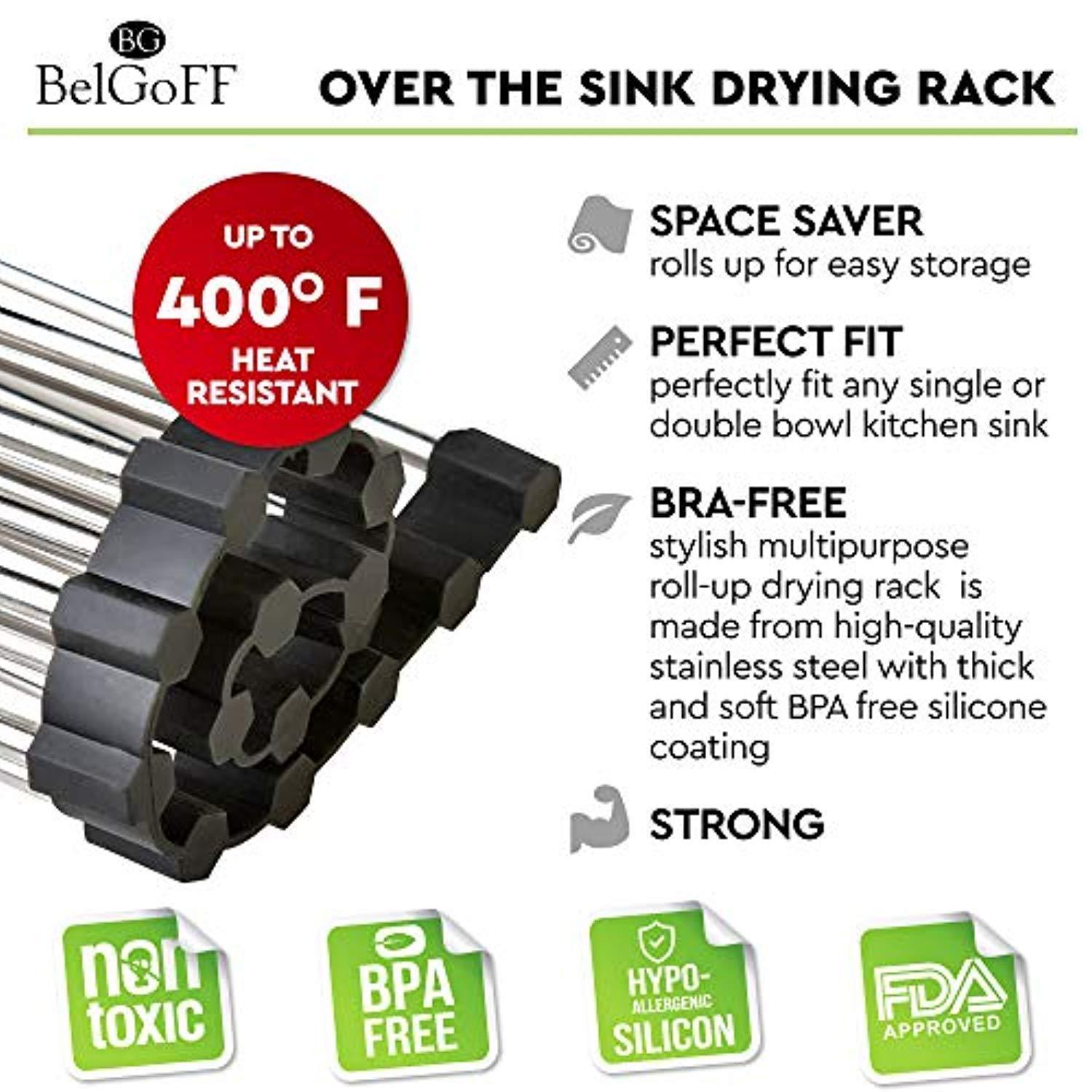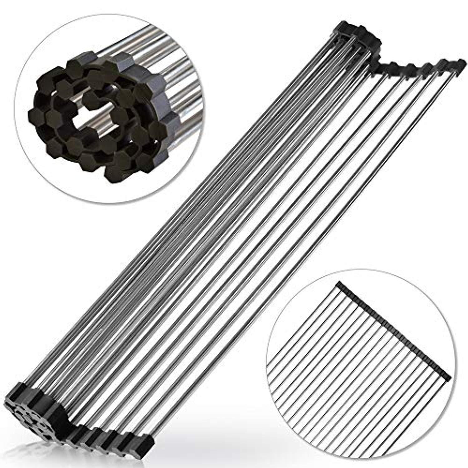 • HIGH QUALITY - The kitchen sink draining rack is made of food grade stainless steel rods with silicone rubber which guarantees its long life and makes the rack organizer durable and non-slip.