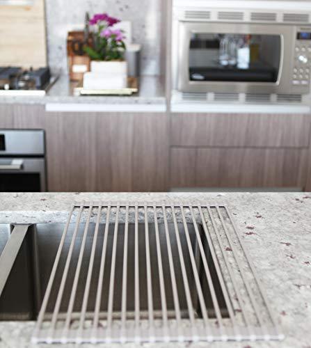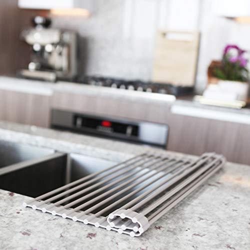 Roll Up Sink Drying Rack by MagnaLecta – Multipurpose Over the Sink Silicone Coated Stainless Steel Self Draining Roll-Up Dish Rack Holder, Foldable, Heat Resistant, Easily Adjustable(Warm Gray,Large)