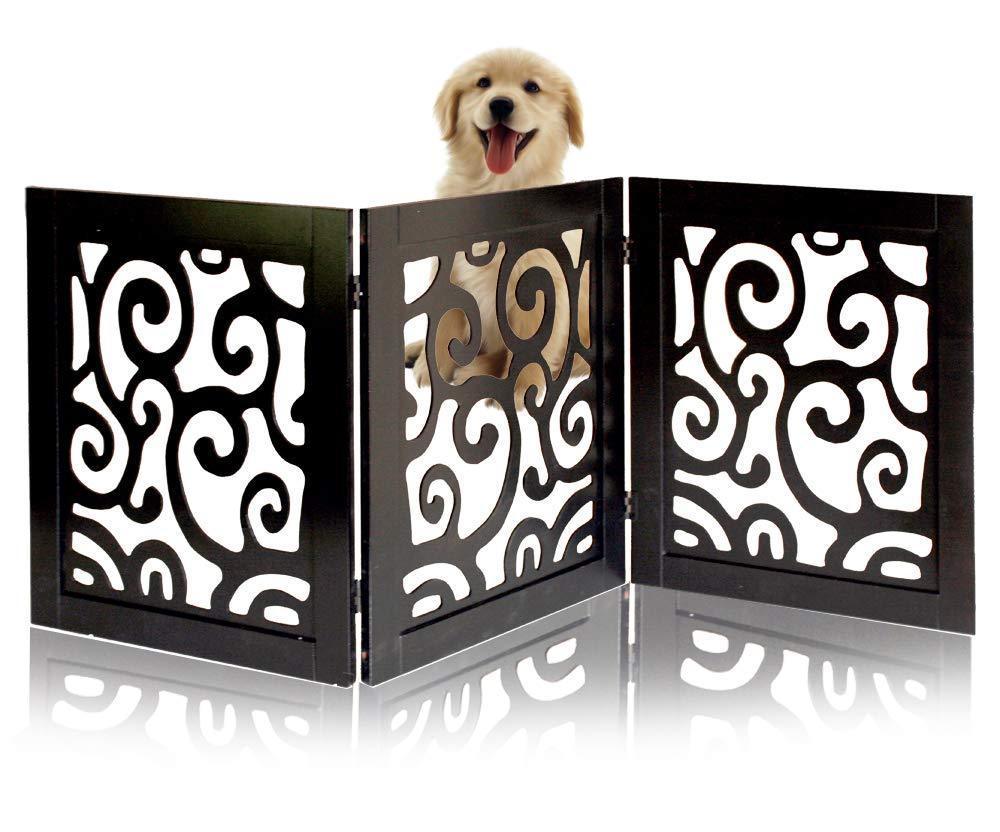 Safety Pet Gate for Dogs - Free-Standing & Foldable - Decorative Scroll Wooden Fence Barrier - Stairs...