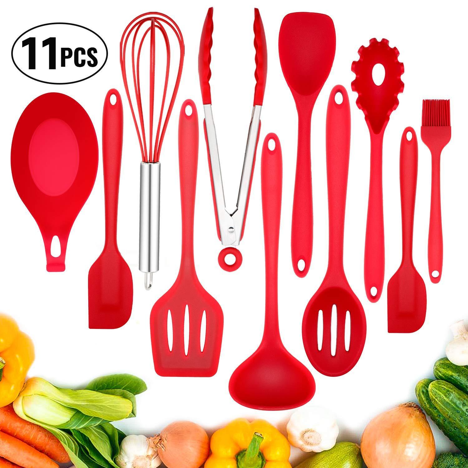 Silicone Kitchen Utensils Set, BAYKA, Non-stick Silicone Utensils 11 Pieces Heat Resistant Cooking Set with Tongs, Basting Brush, Slotted Spoon, 2 Spatulas, Seamless Design Best Kitchen Tools for Gift