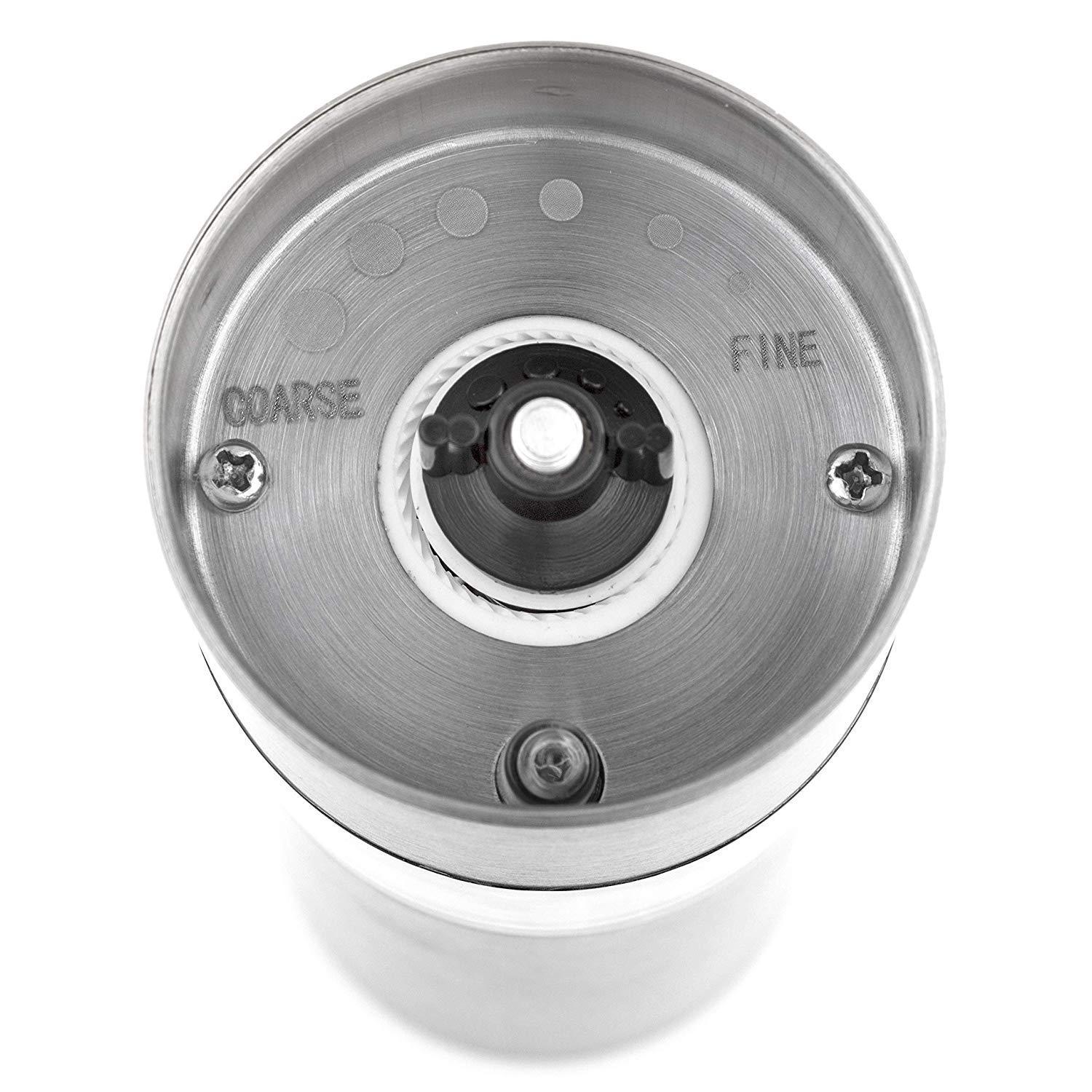 • Modern One-Hand Operation; Easily control the grinder while multitasking in the kitchen by pushing the stainless steel button which means less wasted ingredients (compared to gravity mills) while grinding the perfect amount for your recipe.