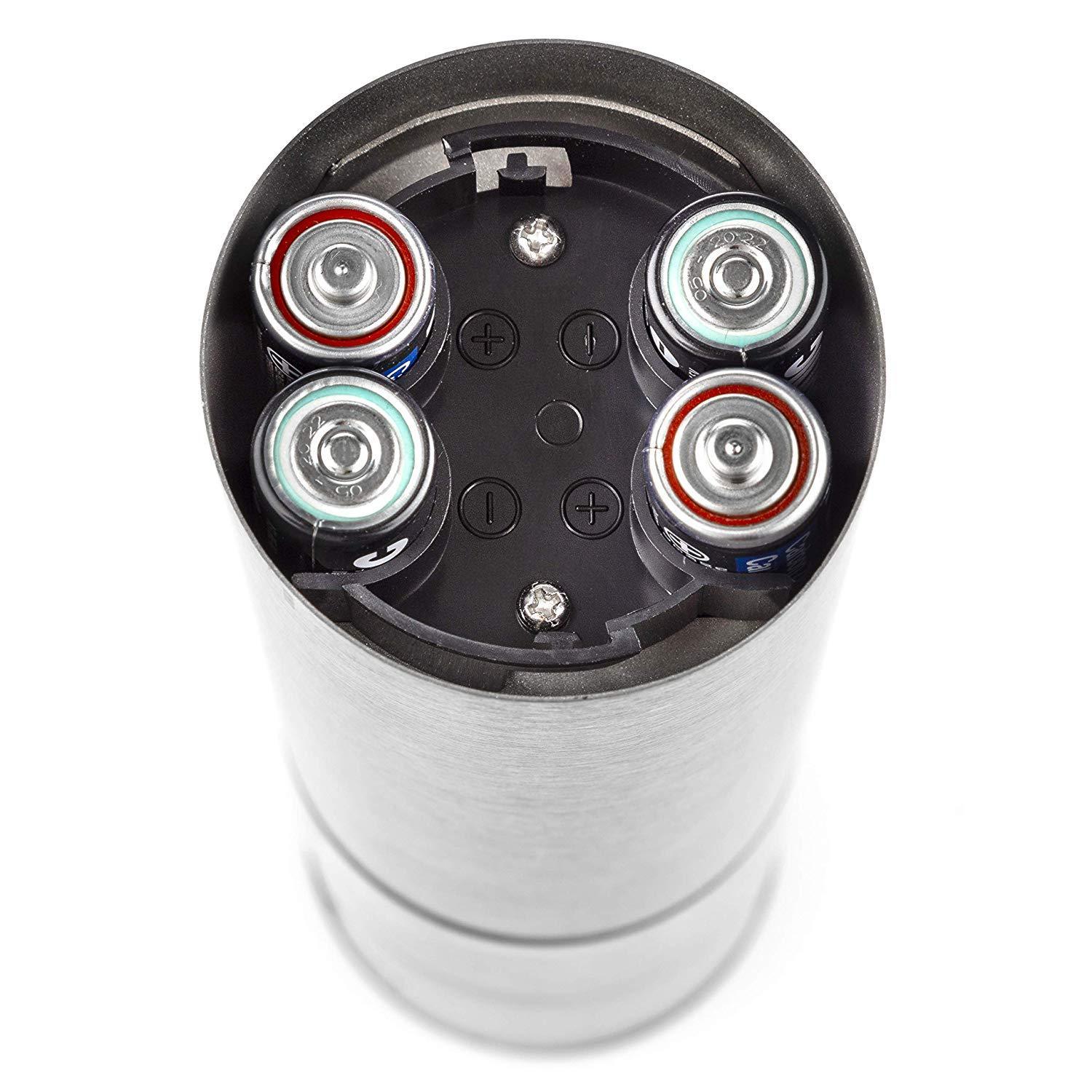 • SIMPLE LOFT Electric Salt and Pepper Grinder Set; Our automatic (battery powered) stainless steel salt and pepper mill set is built to last with the highest quality materials and comes with a built in grinding light, elegant metal stand, protective rubber caps and a free cleaning brush.