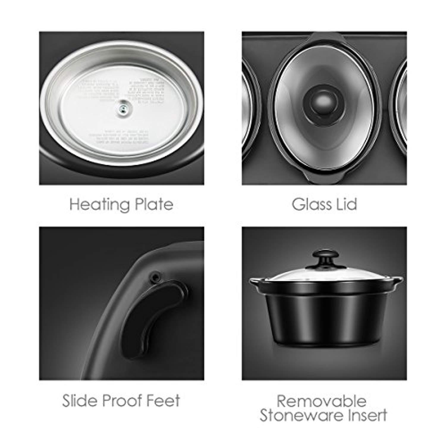 Three removable 1.5Qt stoneware inserts and powered at 270 Watts Independently Temperature Controls with Low, High and...