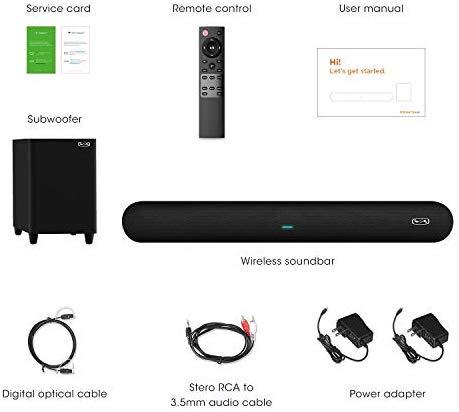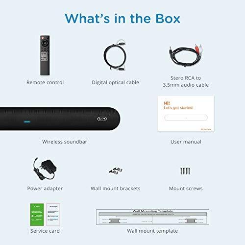 • What is in the box: sound bar, power adapter, remote, audio and optical cable, user manual, wall mounts accessories and service card.