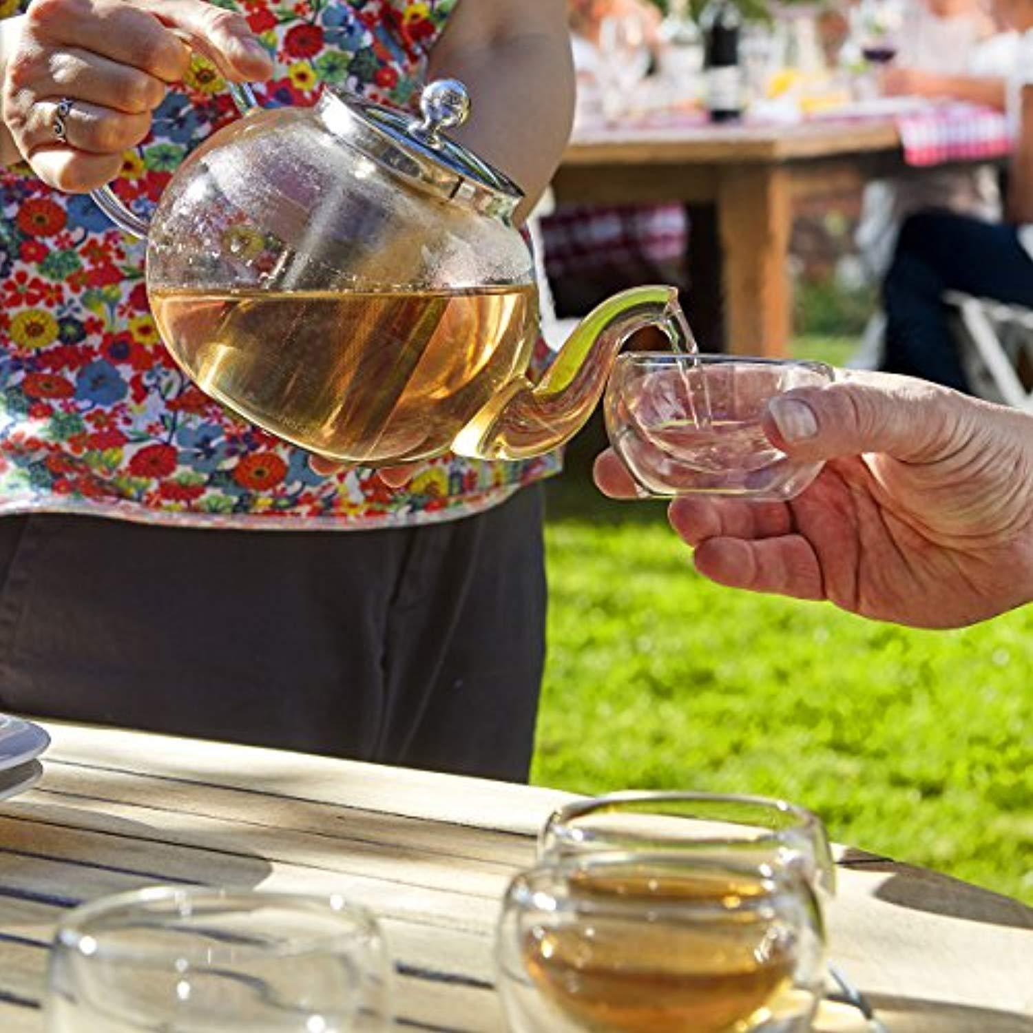 • [ COMPLETE TEA POT SET ] Not only are you getting a teapot but also 4 double walled glass cups, making it a complete serving set. Drink with style and not worry about matching tea cups anymore! The tea maker comes with a rust-free stainless steel tea strainer basket holds teabags or loose tea leaves which can be removed after your tea has steeped. The deep infuser goes right to the bottom of the teapot so that if you only make tea for one or two, you don't have to fill it right up to the top!