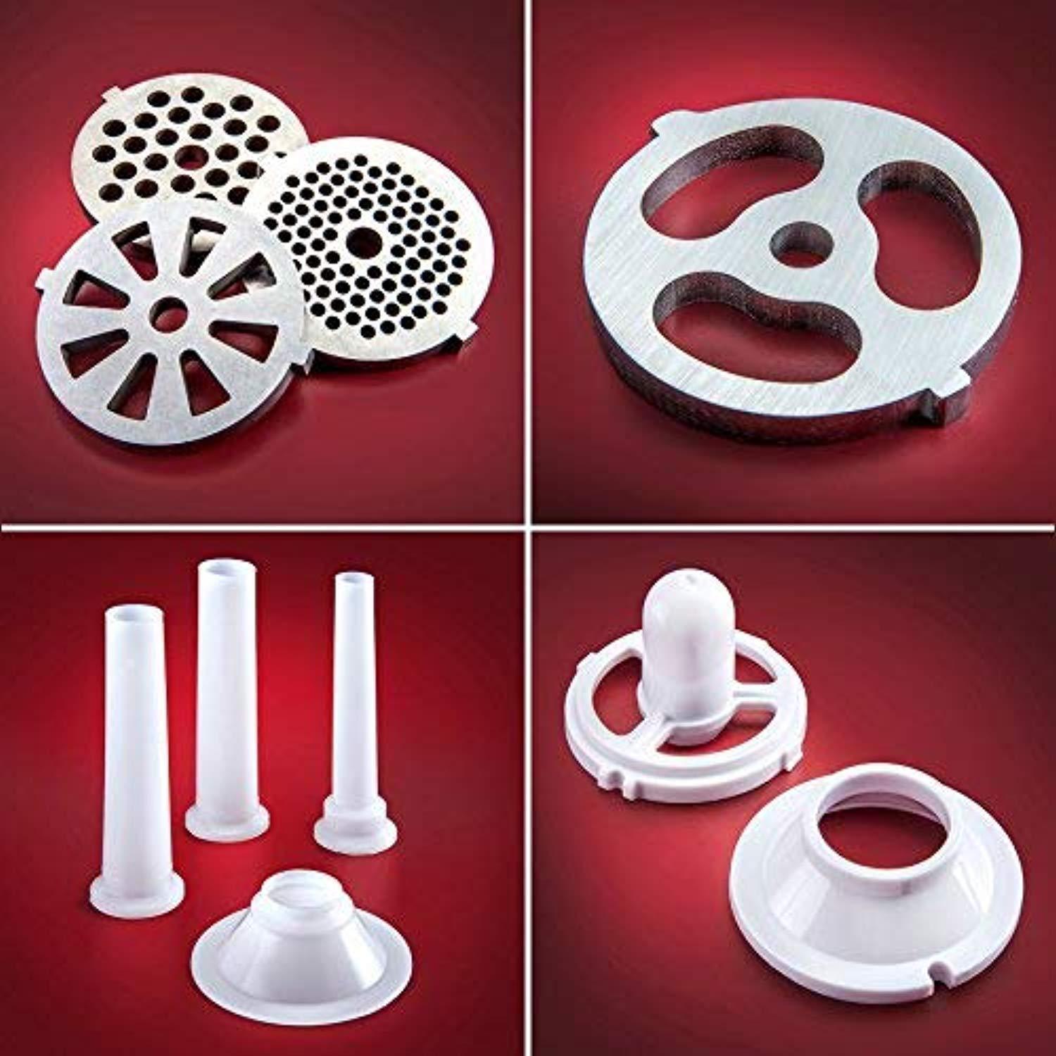 • Includes: 1 - Size #12 Polished Aluminum (Food Grade) Grinding Head and Meat Hopper, 3 - 304 Grade Stainless Steel Cutting Blades, 3 - Sizes of Grinding Plates, 1 - Beaner (Sausage Stuffing) Plate, 3 - Sizes of Sausage Stuffing Tubes (1/2", 5/8" & 3/4"), 1 - Kubbe/Kibbe Making Attachment & 1 - Meat Pusher/Stuffer.