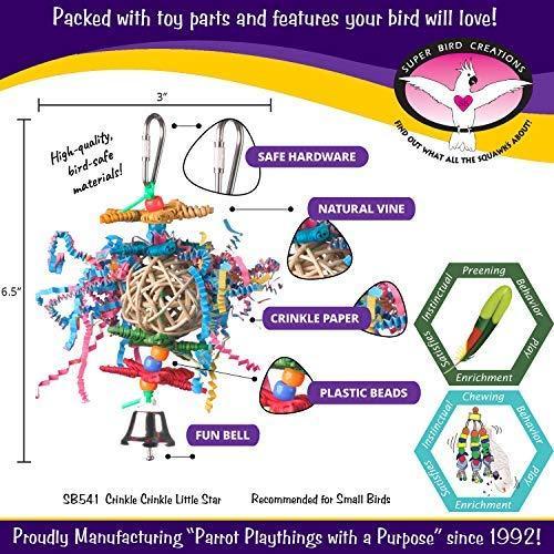 • FOR SMALL BIRDS – The Crinkle Crinkle Little Star bird toy by Super Bird Creations is the perfect size for perfect size for Parrotlets, Parakeets, Cockatiels, Lovebirds and similarly sized pet birds.