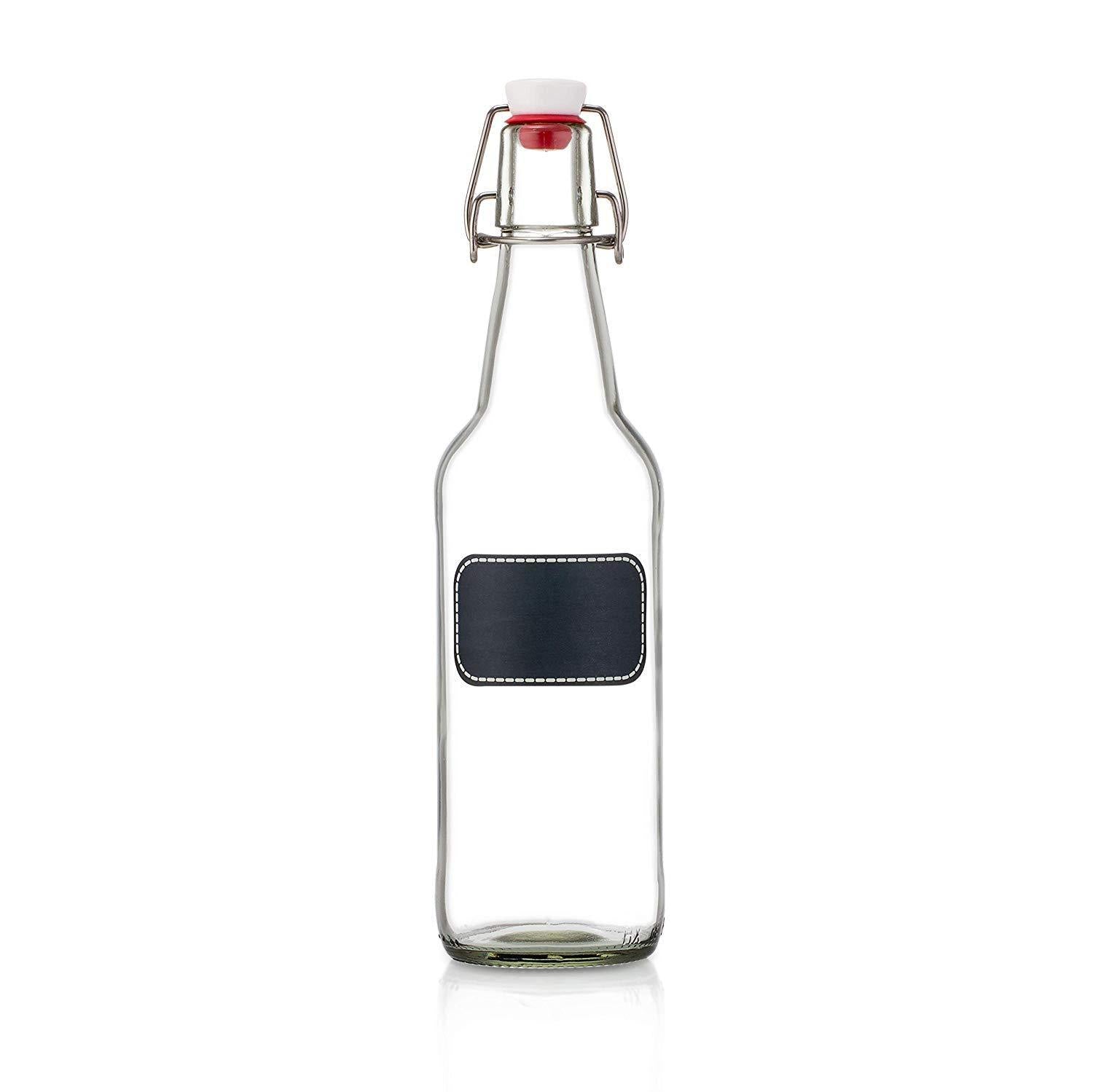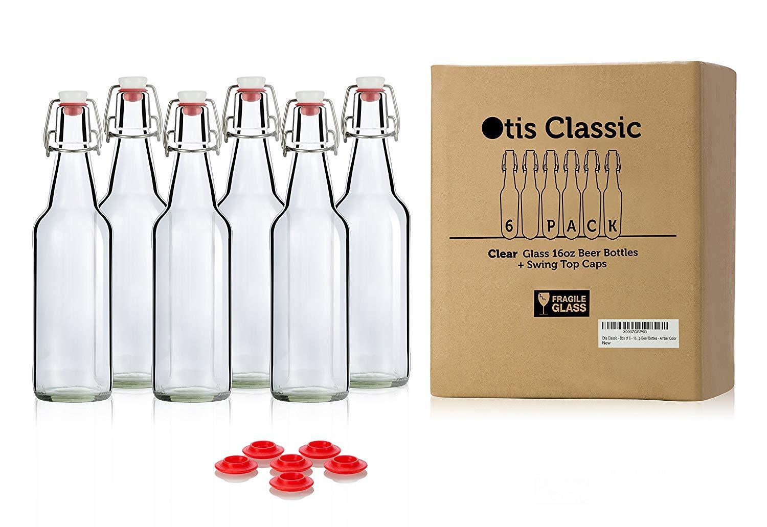 Swing Top Glass Bottles - Flip Top Brewing Bottles For Kombucha, Kefir, Beer - Clear Color - 16oz Size - Set of 6 - Leak Proof Easy Caps, Bonus Gaskets, Chalkboard Labels and Pen - Fast Clean Design by Otis Classic
