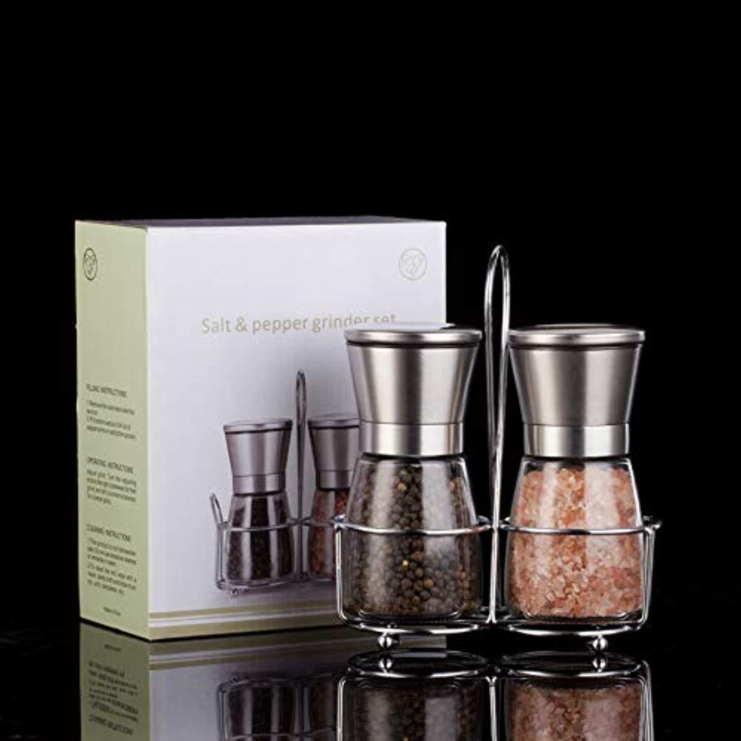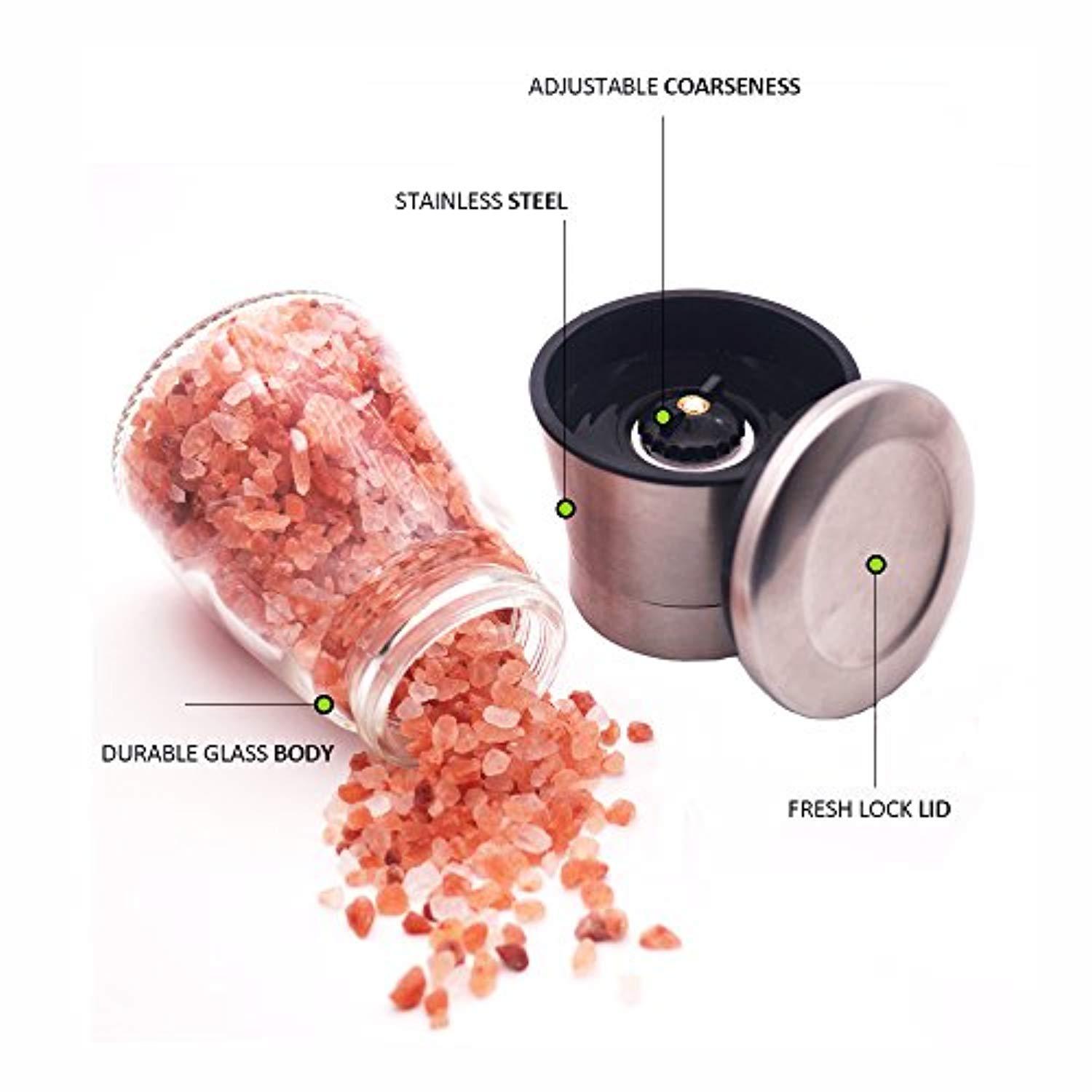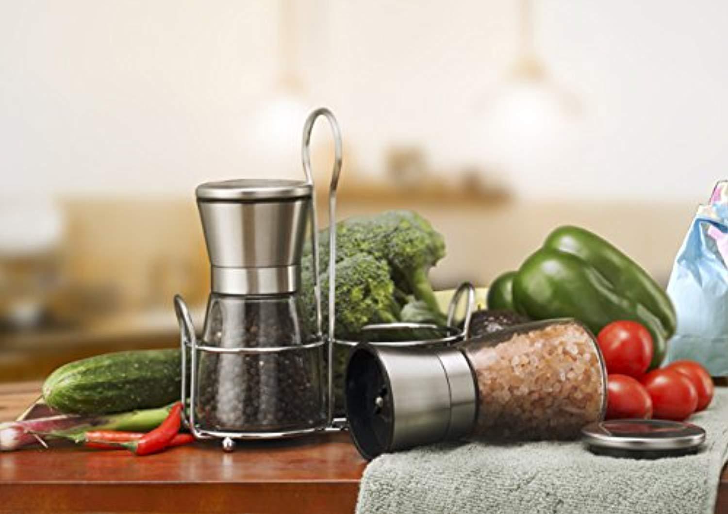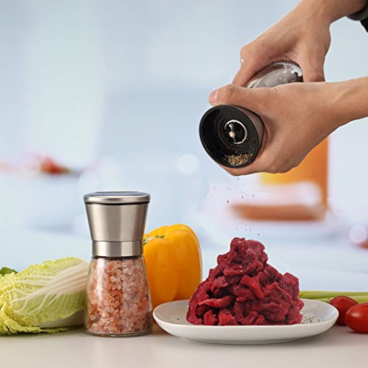 • HCMPLICHCY and ELEGANCE -- The brushed stainless steel top and the clear glass body made these shakers incomparably modern and smart.Our salt and pepper grinder will spice up your dining table .