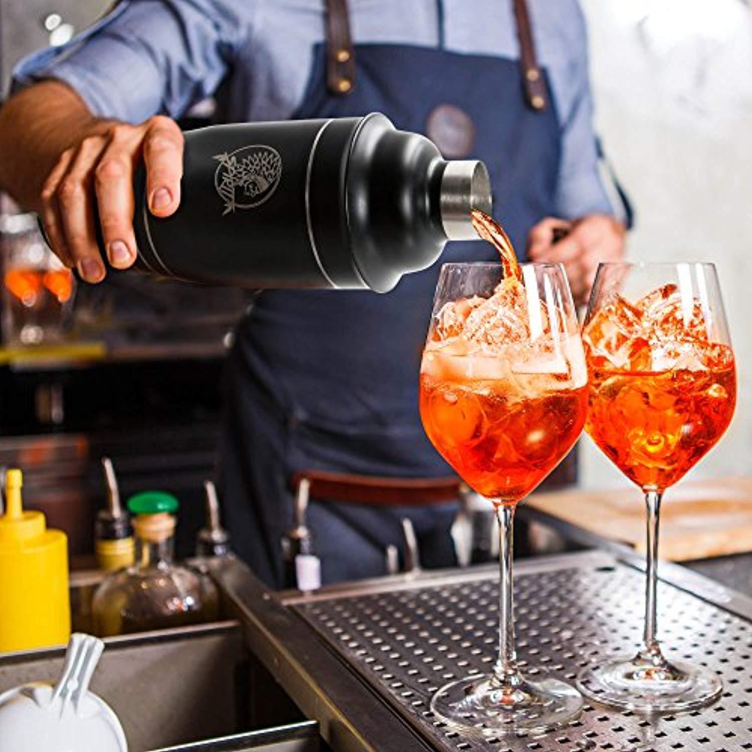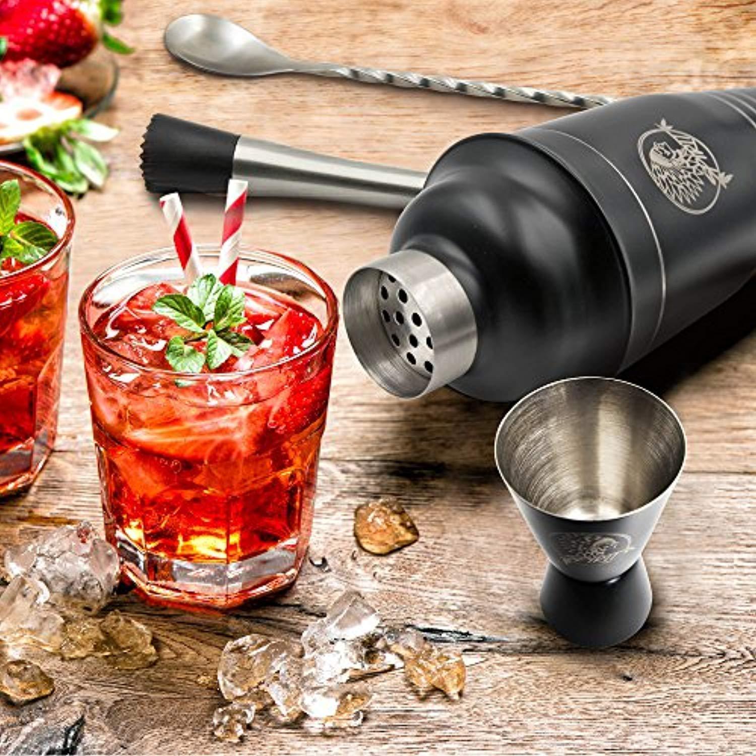 • The bartending set includes 8 items: 24oz black cocktail shaker, muddler, mixing spoon, 0.5/1 oz jigger, 2 pourers, 0.87 Inch bottle opener ring, Spirit branded fabric bag & a colorful recipes ebook.