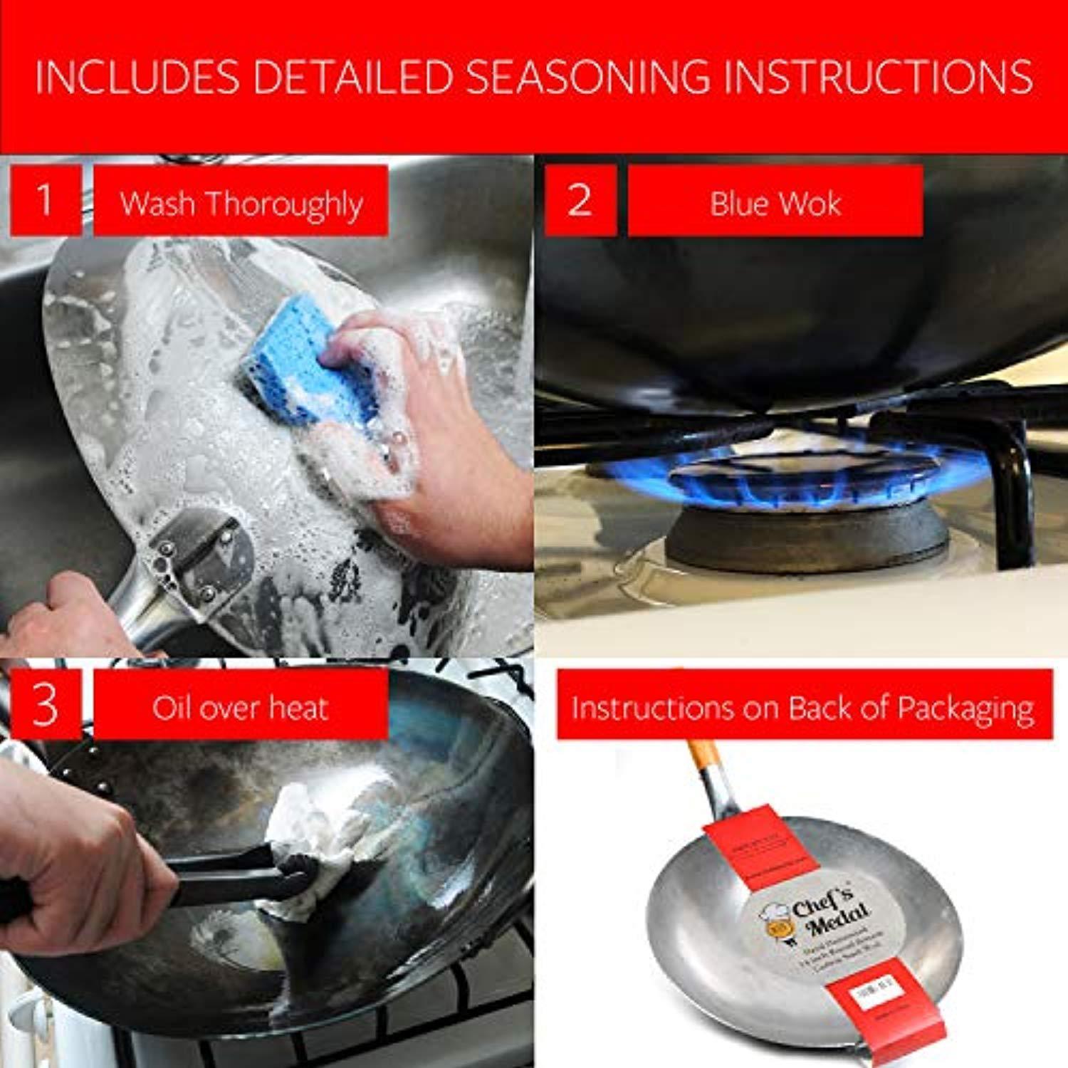 • Instructions are included to season wok to become non-stick – the heating process blues the metal creating a beautiful piece to display in your kitchen.