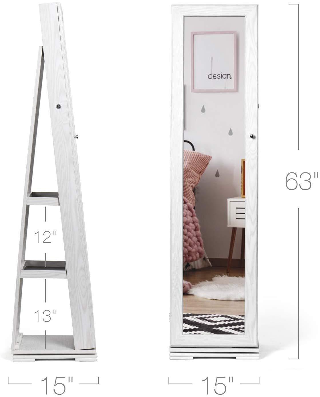 TWING Jewelry Organizer Jewelry Cabinet 360 Rotating, Lockable Standing Wall Jewelry Armoire with Full Length Mirror Large Jewelry Armoire Cabinet(White with Wood Grain)