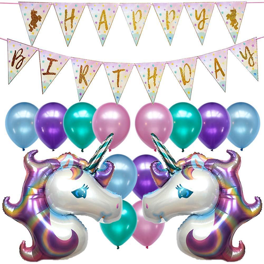 Unicorn Birthday Party Decorations Banner Decor Supplies Set Kit Favors | 2PC Foil Balloon | 12PC Helium Pastel Balloons w/Gold Ribbon | for Boy Girl 1st 2nd 3rd 10th 13th 20th | Sparkle Flag Glitter