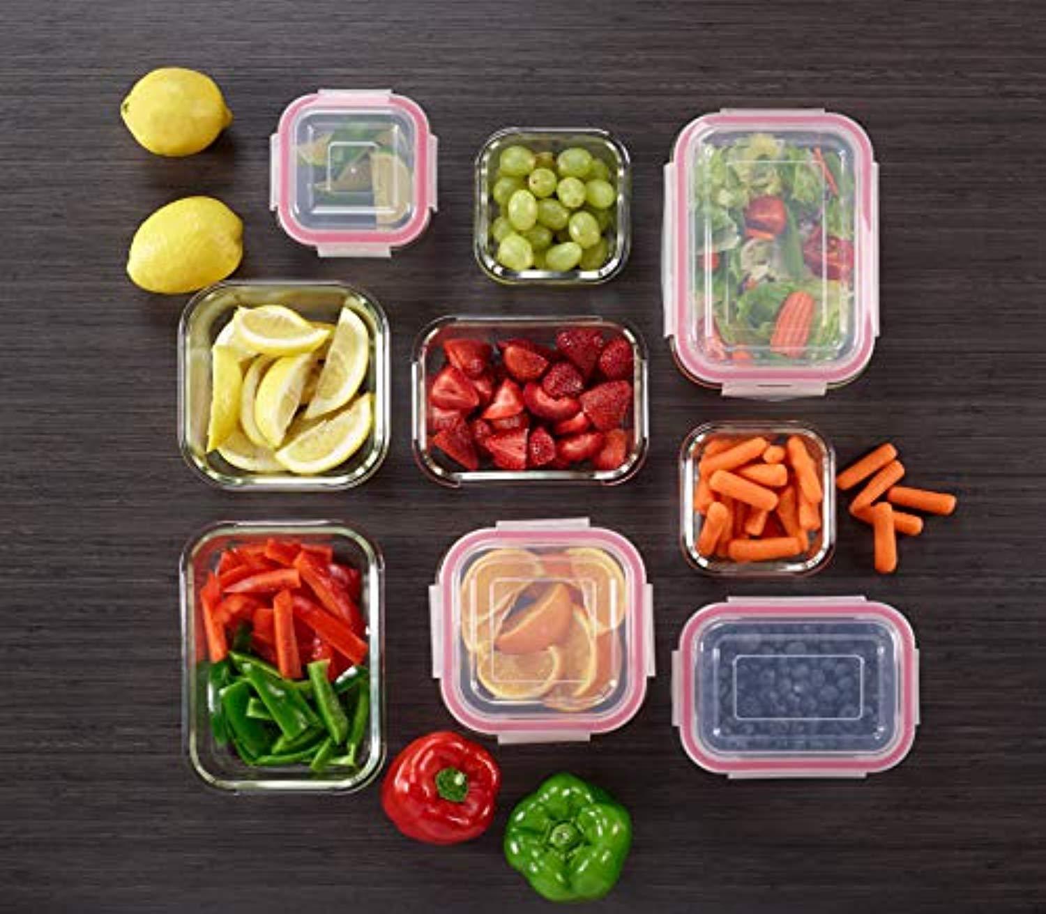 • SIZES FOR EVERY NEED - The glass food container set of 9 helps you customize and organize your on-the-go life! Portable sizes designed specifically for lunch, picnic, school, sports, meals and snacks. This set includes 9 glass containers of varying sizes and 9 matching snap locking leakproof lids.