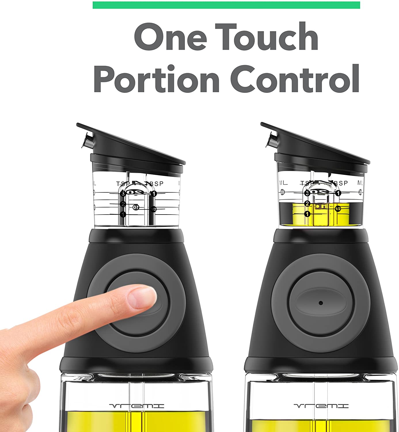 • BIG OIL PUMP for PORTION CONTROL - Squeeze silicone button pump to emulsify or blend liquids for marinade or infuse Italian olive oils with herbs, and easily control amounts of oil or vinegar with pre-portioned liquid and controlled metal spout