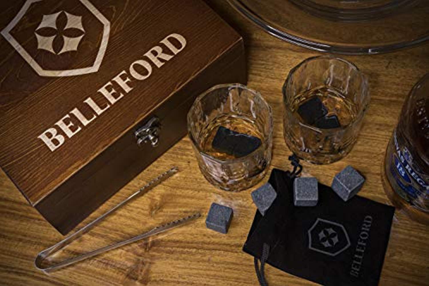 • ✅ PERFECT GIFT SETS: 2 Scotch glasses, 8 chilling cubes, freeze pouch, metal tongs and a neat wood box make our whiskey set the ideal present. Note: No whiskey decanter or drink in the box!