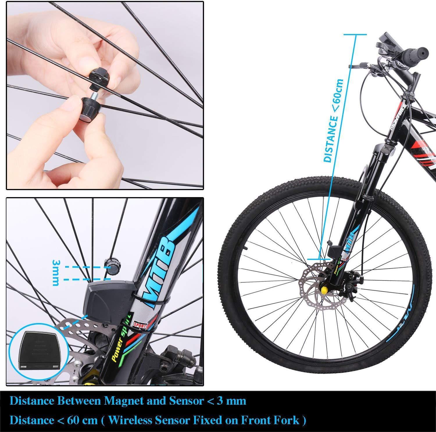 • ✔INSTALLATION & RESTRICTIONS - Installing distance requires no more than 60cm or 23.62 inch from the bike computer to the sensor, so the sensor must be installed onto the front fork of the bicycle; magnet has to be very close to the sensor, the gap between the front fork and the spoke should be less than 2.2 inch, so is not suitable for large sized fork