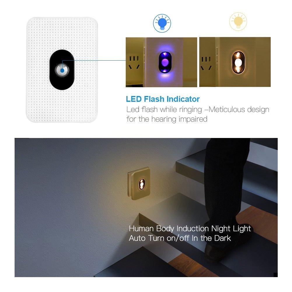 • LED FLASH&NIGHT LIGHT : The LED indicator in wireless door alert receiver and sensor offer additional assistance for the hearing impaired.Built-in body Induction night light auto turn on and 45s delay off in the dark .