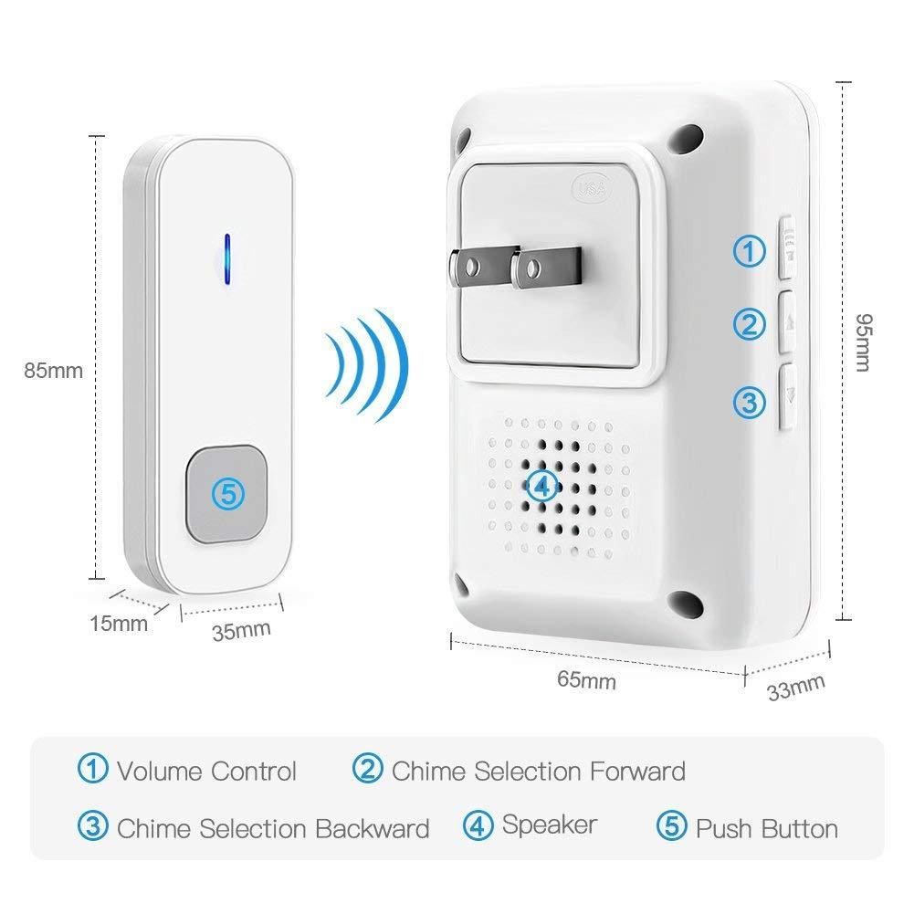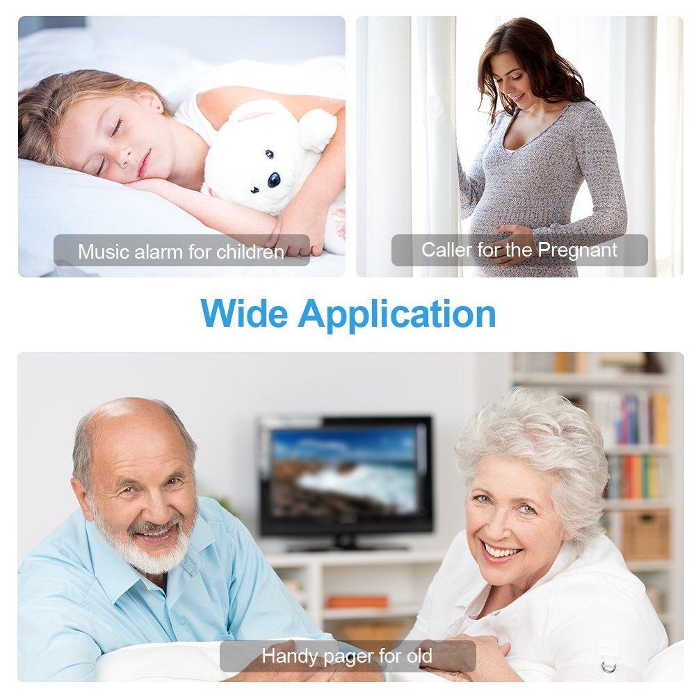 • 55 CHIMES WITH 5-LEVEL ADJUSTABLE VOLUME: The no battery receiver provides 55 different ring tones with adjustable volume from 0-110dB. Perfect as urgent pager for the older, or pregnant women, music alarm for children, dog training and portable paging system.