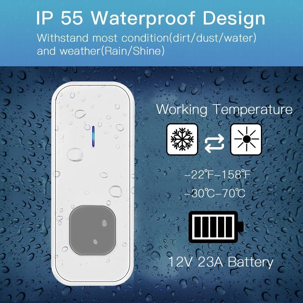 • IP55 WINDPROOF&DURABLE: The push button powered by 12V/23A battery is rated IP55 weatherproof and dust proof for both indoor /outdoor. Working between -22 °F to 158°F withstands various harsh/cold weather conditions.