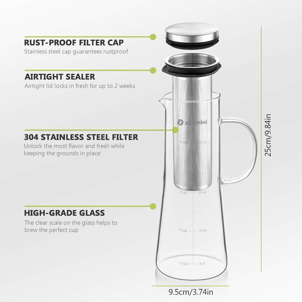 • Higher Quality and Durability: Made from high-grade stainless steel ( 304 ) removable precision cut filter&lid and borosilicate glass, zanmini cold brew coffee maker is very strong, the airtight sealer won't leach nasty chemicals into your coffee. temperature range is - 20 Deg.C to 200 Deg.C. Dishwasher-safe&Easy-clean.