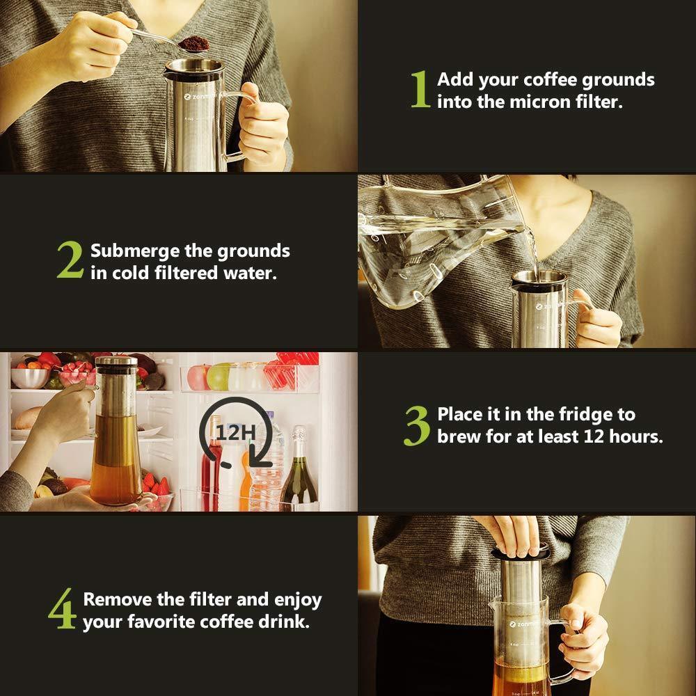 • Got Delicious Cold Brew Coffee in 3 Steps: Add the coffee ground into the filter, then submerge the ground in cold fliter water, finally put it in the fridge, 12 hours later you will get a fresh 32 ounces cold brew coffee. Don't have to go to the coffee shop to buyer any more.