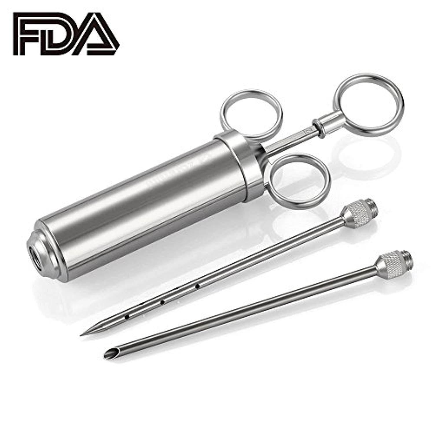 • ❤[PREMIUM QUALHCY] - This heavy duty cooking injector is made of Food Grade 304 stainless steel . FDA approved.Sturdy stainless-steel construction to last year after year.It is healthy and safe, it won't rust or corrode, bend or break under pressure, you can easy puncture the meat with this injector without blocking.